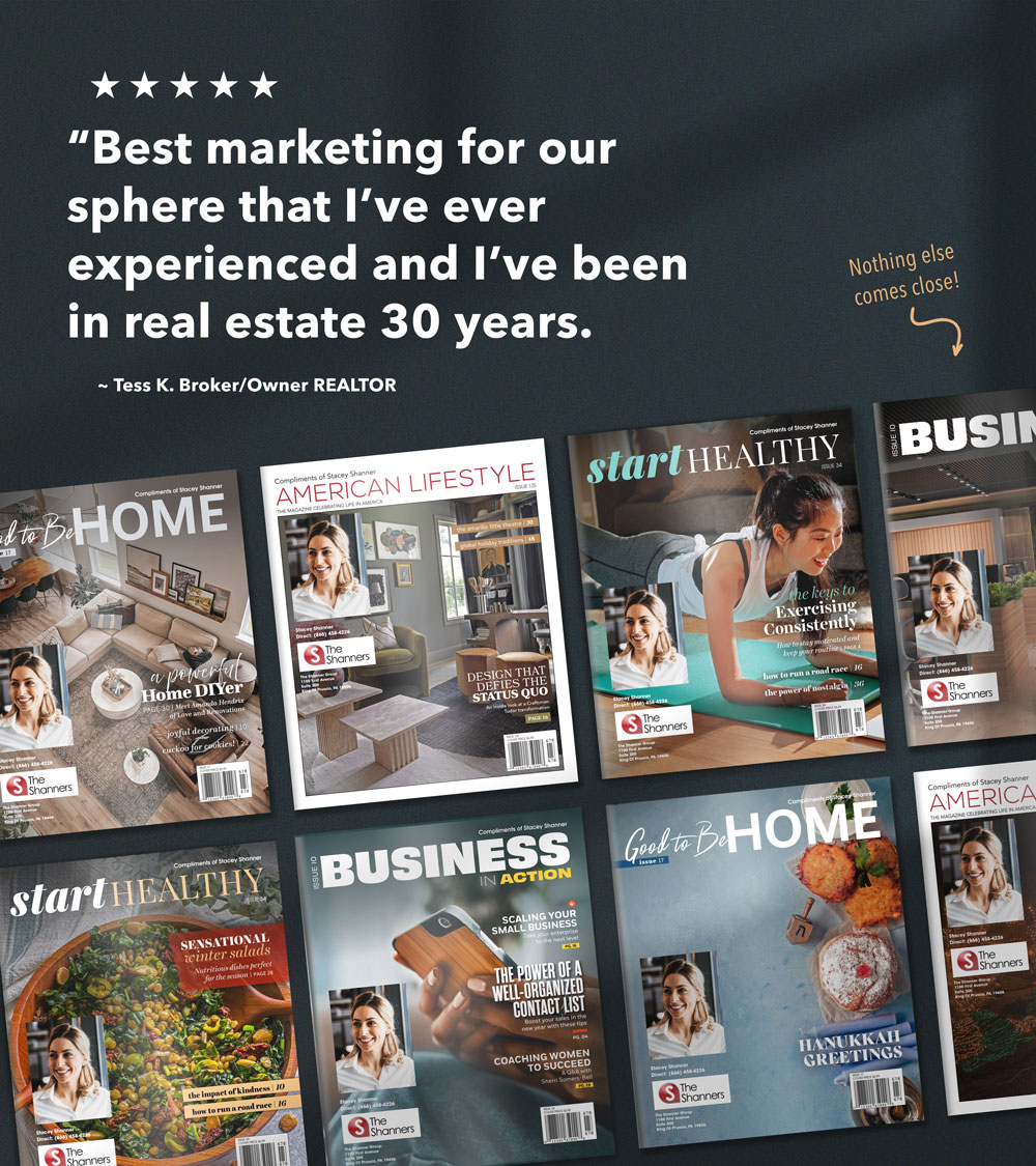 “Best marketing for our sphere that I’ve ever experienced and I’ve been in real estate 30 years. A joy to send and also to bring to local businesses. Also great for listing presentations. Very well produced and best customer service ever. Fast responsive and personal. Have nothing critical to say!~ It’s perfect !~”
